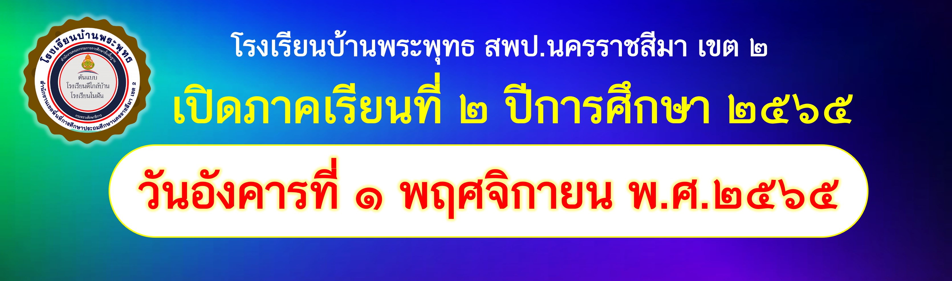 โรงเรียนบ้านพระพุทธ สำนักงานเขตพื้นที่การศึกษาประถมศึกษานครราชสีมา เขต ๒ กำหนดเปิดเรียนทุกระดับชั้น ประจำภาคเรียนที่ ๒ ปีการศึกษา ๒๕๖๕ ในวันอังคารที่ ๑ พฤศจิกายน ๒๕๖๕