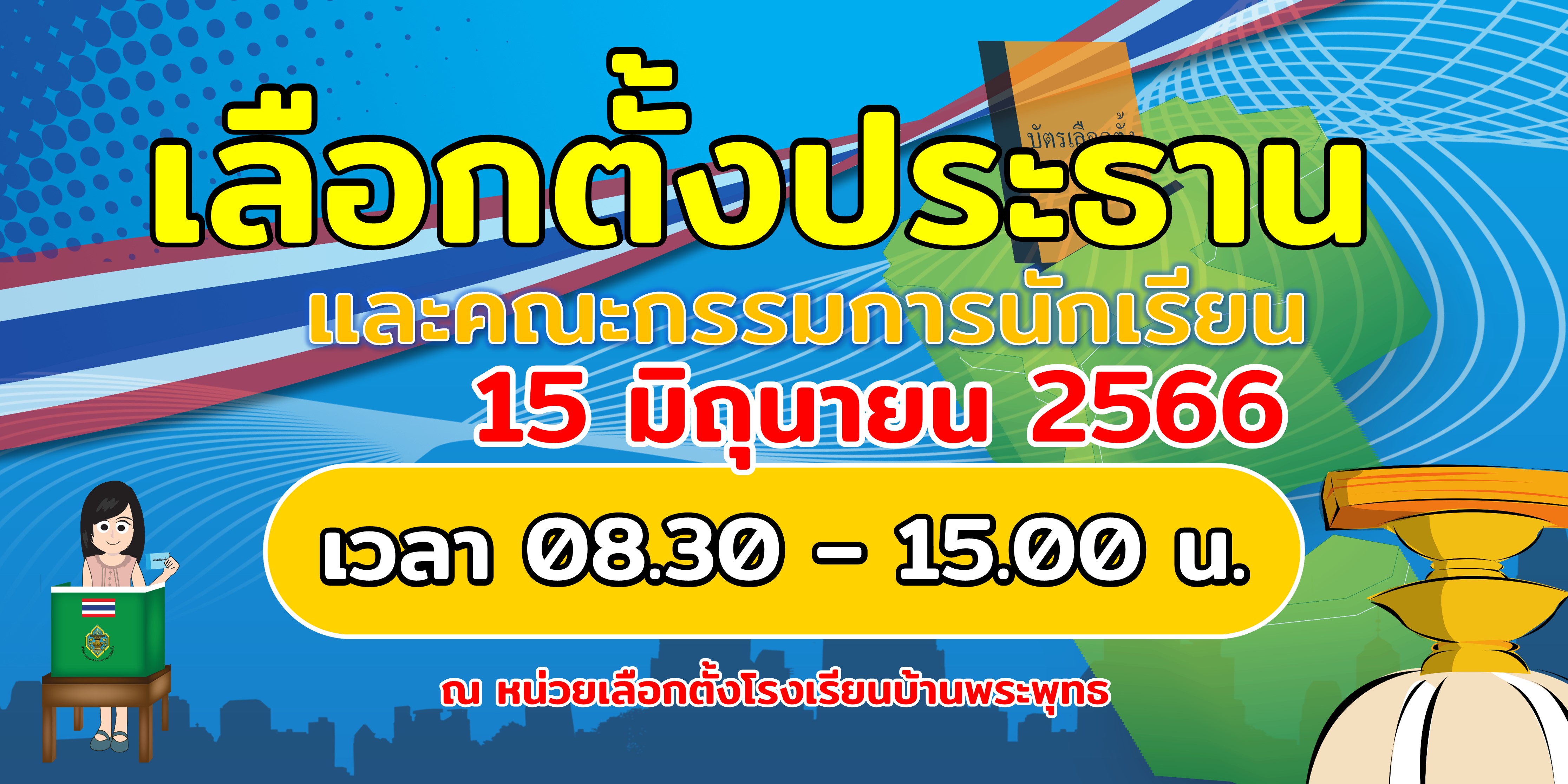 งานกิจการนักเรียนโรงเรียนบ้านพระพุทธ เชิญชวนนักเรียน และบุคลากรของโรงเรียน มาใช้สิทธิ์เลือกตั้งประธานและคณะกรรมการนักเรียน ประจำปีการศึกษา 2566 ในวันพฤหัสบดีที่ 15 มิถุนายน 2566 ณ หน่วยเลือกตั้งชั่วคราว อาคารหอประชุมโรงเรียน ตั้งแต่เวลา 08.30 น. ถึง 15.00 น.